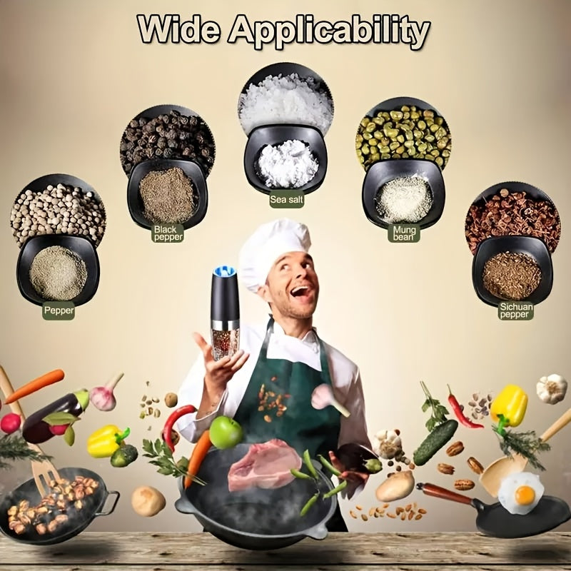 🌟This gravity-activated electric pepper and salt grinder set features adjustable coarseness to suit different tastes 🍴, and includes an LED light for convenient use in low-light conditions 💡. Automatic operation with one hand is simple and efficient, and the elegant black stainless steel design blends perfectly into your kitchen or dining table 🎯. Effortless grinding to enhance your culinary experience!