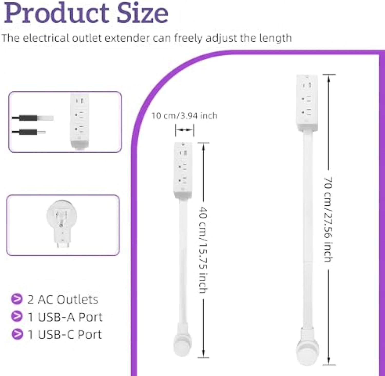 This outlet extender features a retractable design that extends from 15.7 inches to 27.5 inches.