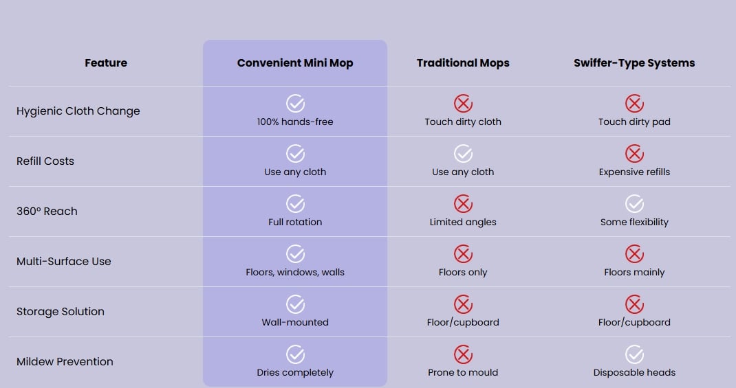 Unlike traditional mops that sit in corners collecting bacteriaand developing that distinctive "sour mop smell," thisone comes with a wall-mounting storage solution.The hanging design allows proper ventilation, keeping themop dry and mildew-free between uses.